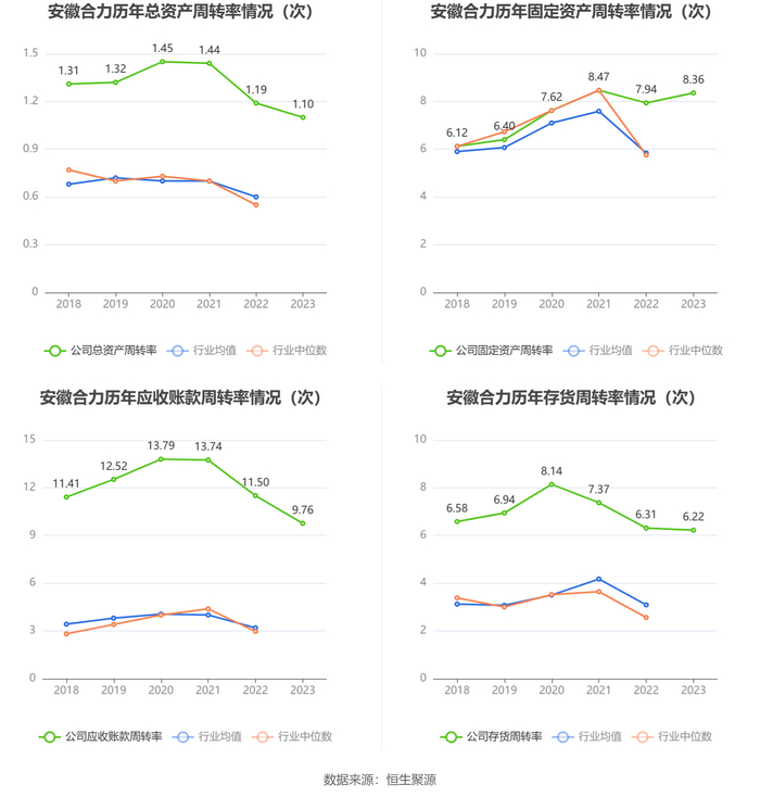 数据统计显示,安徽合力近三年营业总收入复合增长率为10.94%,在工程机械整机行业已披露2023年数据的6家公司中排名第2。近三年净利润复合年增长率为20.42%,排名2/6。
