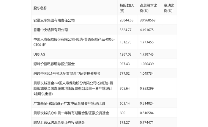 年报显示,2023年末的公司十大流通股东中,新进股东为鹏华汇智优选混合型证券投资基金,取代了三季度末的荷宝基金管理公司-荷宝资本成长基金。在具体持股比例上,中国人寿保险股份有限公司-传统-普通保险产品-005L-CT001沪、UBS AG、北京源峰私募基金管理合伙企业(有限合伙)-源峰价值私募证券投资基金、融通中国风1号灵活配置混合型证券投资基金、景顺长城基金国寿股份均衡股票型组合单一资产管理计划(可供出售)持股有所上升,安徽叉车集团有限责任公司、香港中央结算有限公司、广发中证金融资产管理计划、景顺长城核心中景一年持有期混合型证券投资基金持股有所下降。