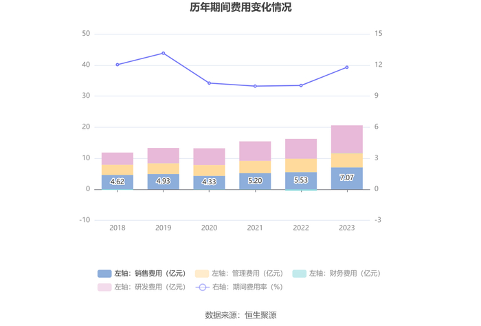 2023年,公司期间费用为20.60亿元,较上年同期增加4.78亿元;期间费用率为11.79%,较上年同期上升1.76个百分点。其中,销售费用同比增长27.78%,管理费用同比增长4.45%,研发费用同比增长39.75%,财务费用由去年同期的-4263.16万元变为843.02万元。