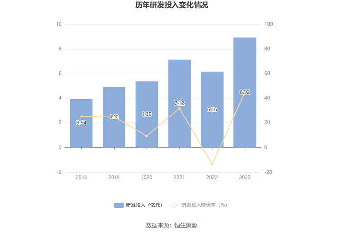 2023年全年,公司研发投入金额为8.92亿元,同比增长44.72%;研发投入占营业收入比例为5.10%,相比上年同期上升1.17个百分点。此外,公司全年研发投入资本化率为0。