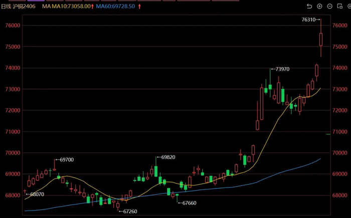 而在国际铜价假期期间大涨的背景下,沪铜主力合约2405也在8日收涨2.61%,收于75540元/吨,为近两年高点。