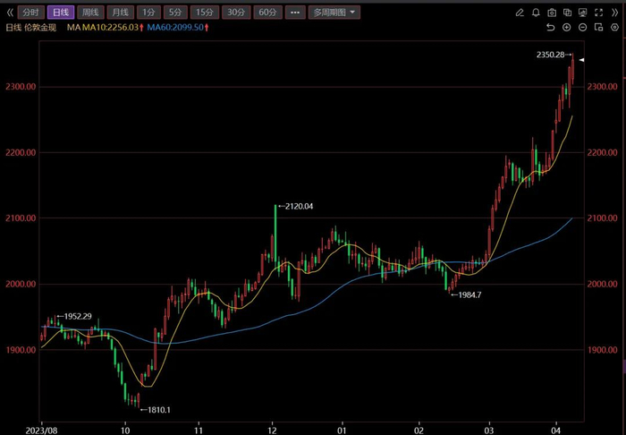 4月8日,伦敦现货黄金突破2350美元/盎司;COMEX黄金报出2372.5美元/盎司的高价;COMEX白银价格也来到28.195美元/盎司。