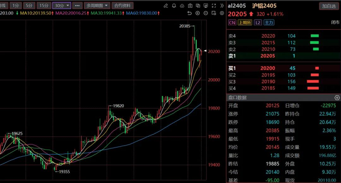 4月8日盘中,沪铝主力合约2405一举突破2万元/吨关口,一度达到20385元/吨的近两年高点,当日收涨1.61%。