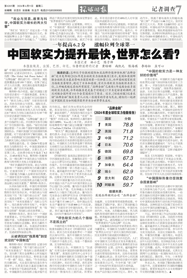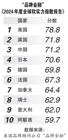 编者的话:总部位于伦敦的国际知名品牌价值评估机构“品牌金融”近日发布的《2024年度全球软实力指数报告》显示,美国和英国蝉联全球软实力最具影响力国家的第一位和第二位,而中国的国家软实力指数显著增长,超过了日本和德国,首次位居软实力指数排名第三位,上升幅度超过其他所有国家。“品牌金融”已连续5年追踪全球多国的软实力表现,今年的报告更是基于对超过17万名受访者的调研,首次对联合国所有193个会员国进行了排名。近日,《环球时报》记者采访“品牌金融”相关负责人以及一些国家的学者与民众,请他们一起讲述中国软实力如何稳步提升并为全世界带来益处。