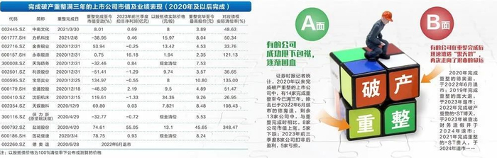 证券时报记者统计,2020年以来完成破产重整的上市公司中,有14家完成重整至今已满3年。除去已于2022年6月退市的德奥退,剩余13家公司中,与重整完成时相比,8家公司市值上涨,5家下跌;2023年前三季度8家公司扣非后盈利,5家亏损。同时满足市值上涨、最新季报和2023年业绩预告盈利的公司有中南文化、永泰能源、盐湖股份和莲花健康四家。