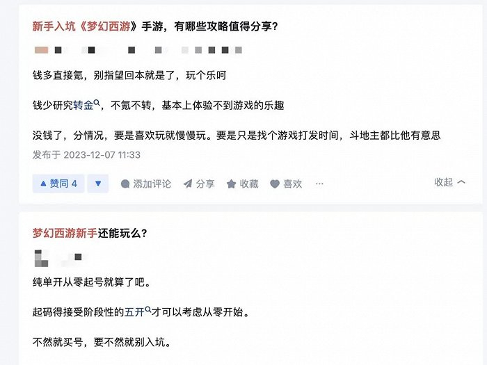 在各种带着《梦幻西游》tag的社交平台上,都会出现各种希望运营组调整游戏玩法与收益的帖子与讯息,这也是“散人”玩家们游戏体验日益下降的一个体现。