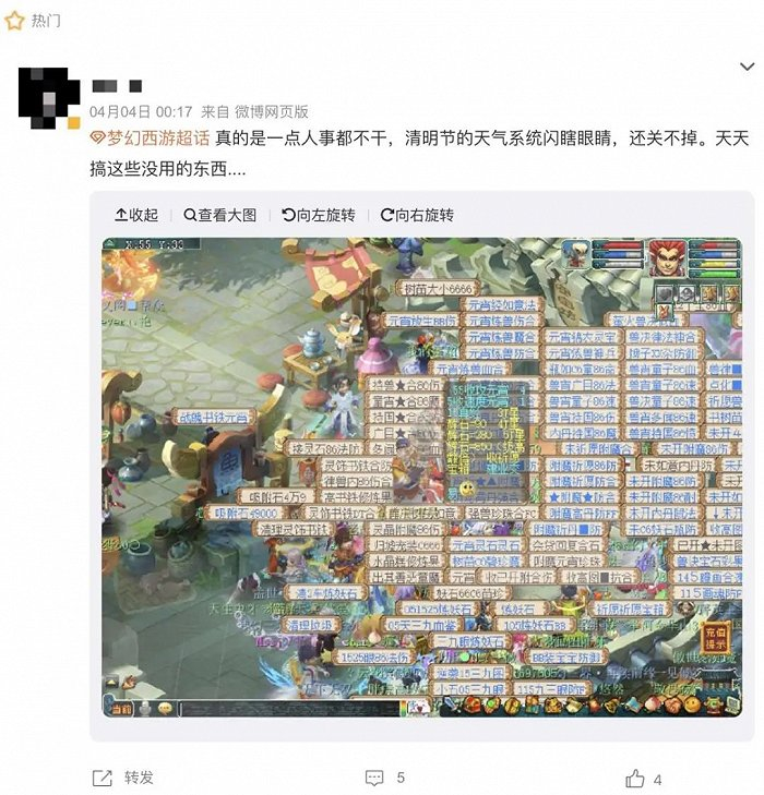 在清明节当天的零点,《梦幻西游》全体玩家的游戏画面上都仿佛被蒙上了一层雾,整个画面变得模糊不清。《梦幻西游》四百余个服务器,玩家们纷纷刷起了“传音喇叭”进行交流与讨论,据网友估算,这些“传音喇叭”的价值折算成现金,就有几十万之多。