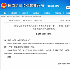 财联社4月9日讯(记者 郭子硕)近日,国家金融监督管理总局浙江监管局审核同意渣打银行(中国)杭州城西支行关闭。这也是继渣打银行(中国)上海淮海中路支行、渣打银行(中国)深圳车公庙支行关闭后,渣打银行(中国)年内第三家支行获批关闭。