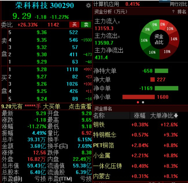 4月9日,荣科科技低开低走,截至发稿,该股跌超11%,报9.29元,换手率7.69%。