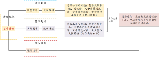 黄金核心属性是货币属性。在传统分析框架中,黄金通常被认为具有三大属性,即商品属性、金融属性和货币属性。商品属性指的是商品需求的增长会推动价格上涨,但黄金在乱世时价格上涨的情况与此不符。而金融属性可以被视为货币属性的一种体现。因此我们概括性地认为,其实三大属性只有一个是重要的,即货币属性,当黄金的货币属性更强时,黄金价格就会涨。
