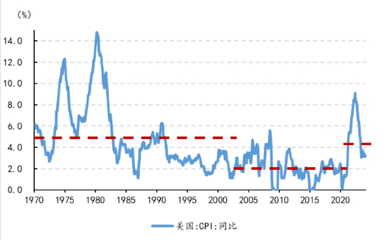 其一,美国为代表的全球通胀大幅缓解。在2000年以前,美国CPI的中枢在5%左右,但是2000年以后中枢回落到了2%以内,在疫情后又回到了3%-4%的水平。