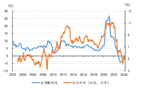 如果过去20年全球宏观的主要矛盾是总需求不足,那么什么时候黄金的货币属性最强(价格最容易上涨)呢?答案就是总需求不足最为严重的时候。全球总需求最为严重之时,表现为经济危机、金融危机,此时美联储往往采取极度宽松的货币政策进行应对,而此时恰恰也是全球信用货币体系最脆弱的时候,所以我们过去二十年常常讲的是,一旦大水漫灌,黄金价格就会上涨。因此从数据上来看,黄金价格的涨幅,和美日欧主要发达经济体的M2增速是高度相关的。那么为何此时实际利率会比较重要呢?因为实际利率是我们观察全球流动性最高频的指标,而实际利率与全球流动性是负相关的。