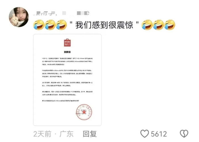 在信中,名创优品就乱起外号这件事向粉丝们道歉,并表示自己很震惊。