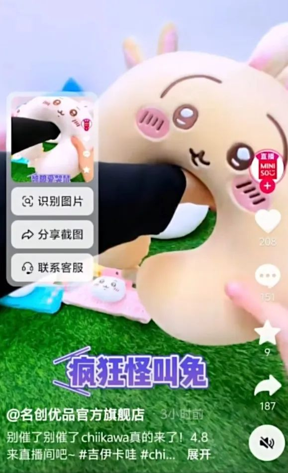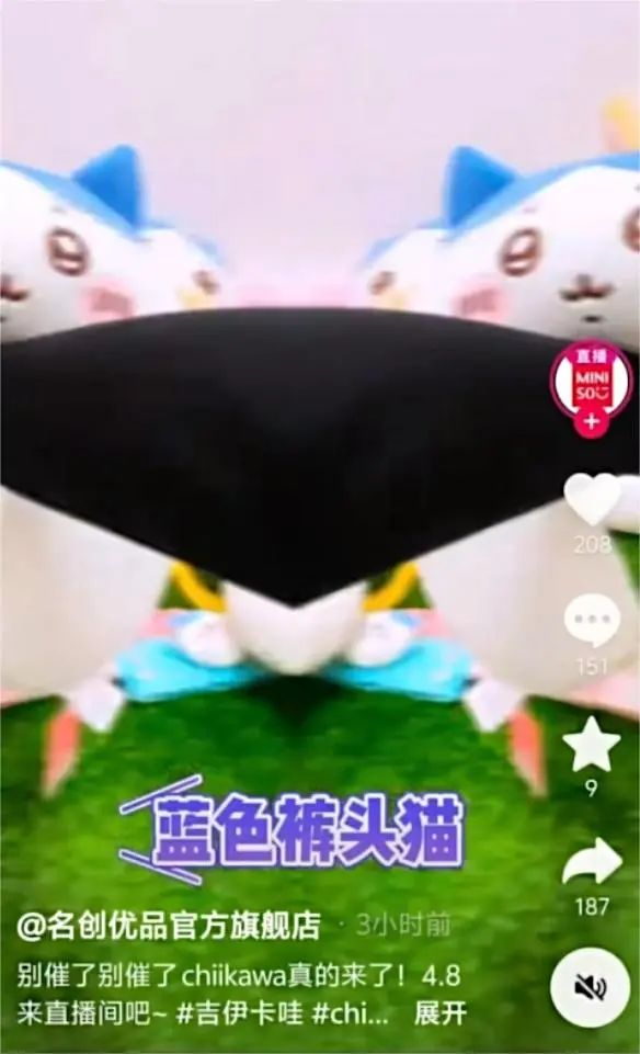 4月3日,名创优品官方抖音发布宣传视频。三位主角乌萨奇、小八和吉伊分别获得“疯狂怪叫兔”、“蓝色裤头猫”、“智障爱哭鼠”的绰号。