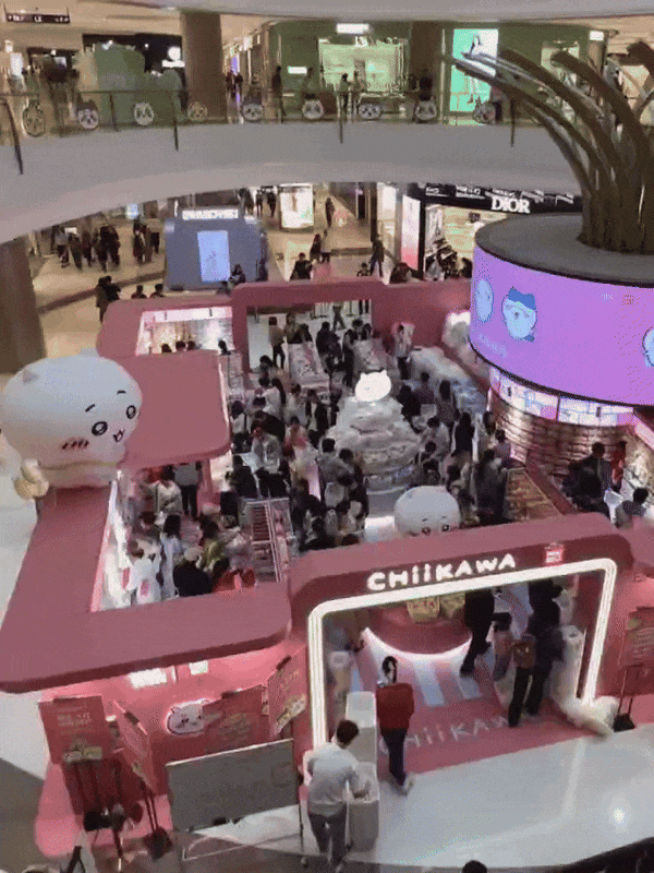 如果你在上海,路过静安大悦城时一定会惊讶地瞪大眼睛。主题贴纸、雕塑、人偶……到处都是Chiikawa的身影。