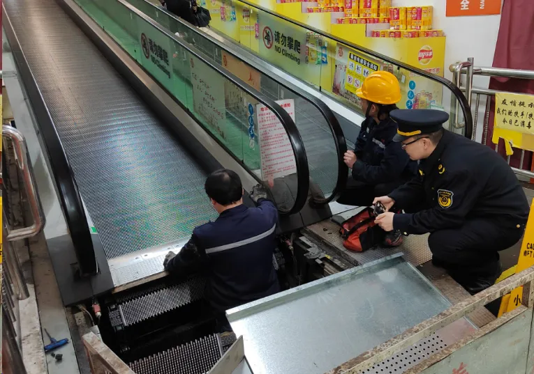 执法人员现场检查自动人行道踏板紧固情况。