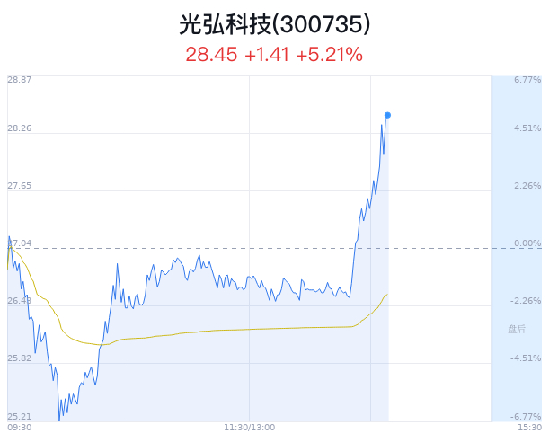 04月09日,光弘科技(300735)股价大幅上涨,截至14点08分,光弘科技上涨5.21%,报28.45元/股,成交16.55亿元,换手率8.30%,振幅12.35%。