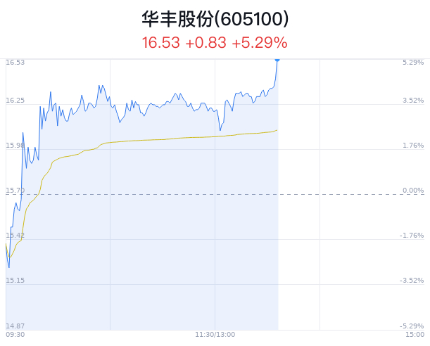 04月09日,华丰股份(605100)股价大幅上涨,截至13点35分,华丰股份上涨5.29%,报16.53元/股,成交1.29亿元,换手率4.72%,振幅8.54%。
