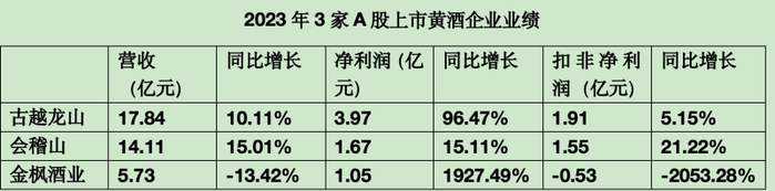 3家A股黄酒上市公司2023年成绩单出炉,古越龙山、会稽山营收、净利润均实现上涨,金枫酒业则营收下降,净利润虽因收到约2亿元房屋征收补偿款而实现增长,却难掩扣非净利润连续4年为负的窘况。