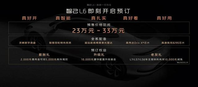 当日,智己L6正式开启预售,预售价格区间:23万元~33万元。智己L6 Max标准版,不超过23万元;智己L6 Max超强性能版,不超过29.99万元;智己L6 Max光年版,不超过33万元。同期,也公布了极具诚意的“限时预订权益”,2,000元意向金即可抵5,000元购车尾款,以及10,000元豪华配置升级基金。