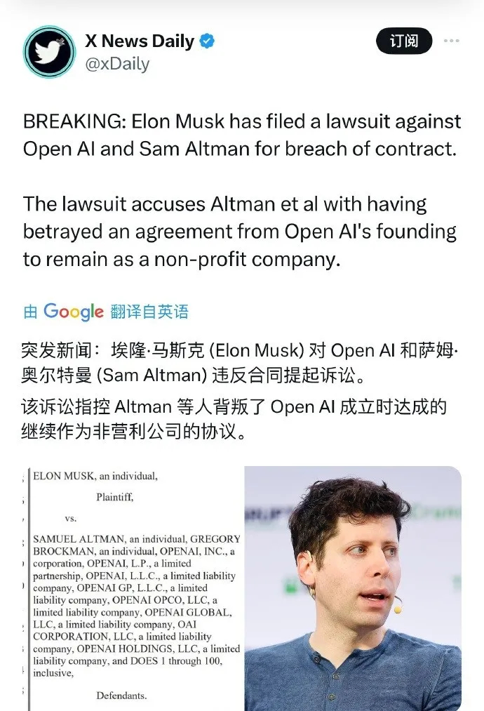 今年2月底,马斯克起诉OpenAI跟山姆·奥特曼,理由也是OpenAI违背了造福人类非营利的宗旨。
