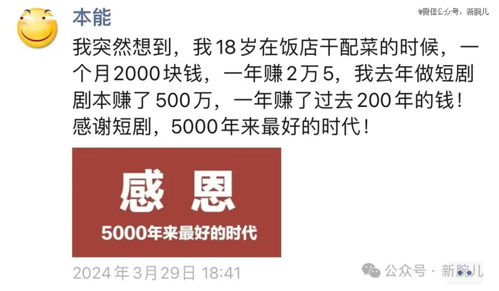 根据本能曾经发过的朋友圈对应,2023年做短剧编剧收入800万元,赚了500万元,以前还在饭店干过配菜工作,一个月工资2000元,一年2.5万元。