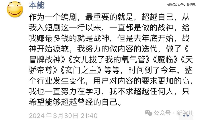 答:我认为作为一个编剧,最重要的就是,超越自己,从我入短剧这一行以来,一直都是做的战神,给我赚最多钱的就是战神,但是去年底开始,战神开始疲软,我努力的做内容的迭代,做了《冒牌战神》《女儿拔了我的氧气管》《魔临》《天骄帝尊》《玄门之主》等等。时间到了今年,整个行业发生变化,用户对内容的要求更加的高,我也一直努力在学习,我不求超越任何人,只希望能够超越曾经的自己。