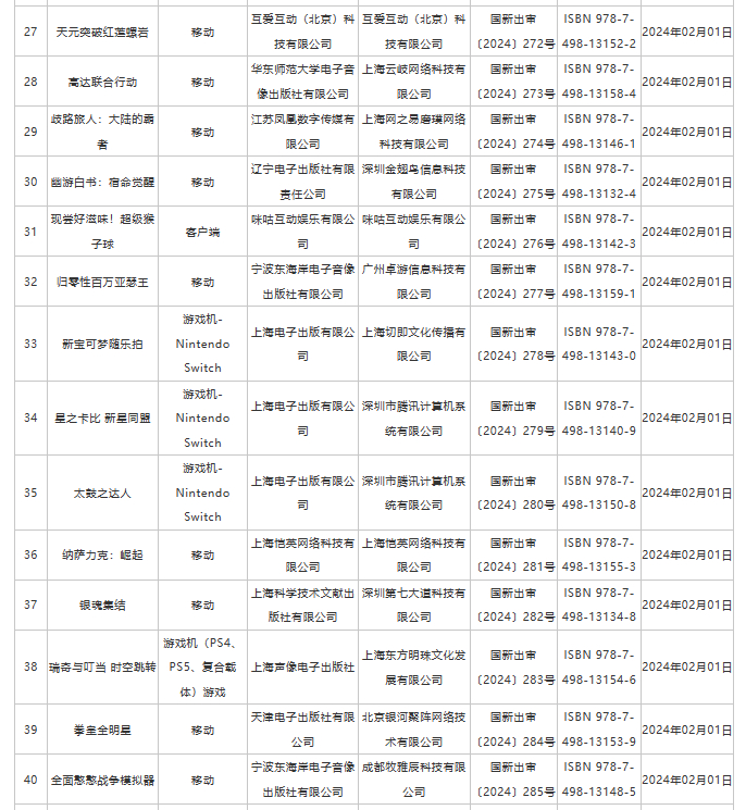 此次获批的46款产品中,《地下城与勇士:起源》《航海王:集结》《新三国志曹操传》《拳皇全明星》等29款游戏将仅在移动端上线;7款将仅在客户端上线;有2款游戏会在移动和客户端同步上线;有8款游戏则将在游戏机平台上线,包括在游戏机(PS4、PS5、复合载体)上线的《瑞奇与叮当时空跳转》和在Nintendo Switch、复合载体上线的《宝可梦 走吧!伊布》《森喜刚热带冻结》《侍魂 晓》,及在Nintendo Switch平台上线的《新宝可梦随乐拍》《星之卡比 新星同盟》《太鼓之达人》;以及将在游戏机(XBOX)上线的《侍魂 晓》。