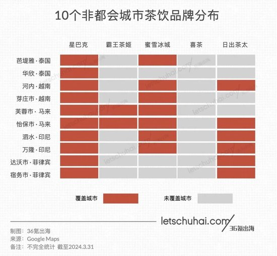 我们在东南亚六国随机选择了10个有星巴克入驻的非都会城市,统计了目前主要加盟茶饮品牌的门店情况(不完全统计 来源:Google Maps)。