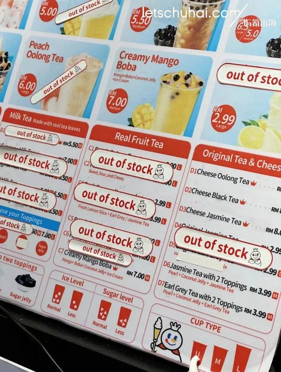 其次是供应链辐射范围对门店选址的限制。蜜雪冰城能够跻身全球前五大餐饮连锁品牌,是因为它在中国拥有绝对的供应链优势,但这个商业模式在海外还行不通。去年以来,社交媒体上能够频繁看到东南亚消费者抱怨蜜雪冰城缺货,一位马来西亚加盟商谈到:“去年6月份整个大马都缺材料,但又不能自己随便去买,因为合约规定一定要用品牌方的。”