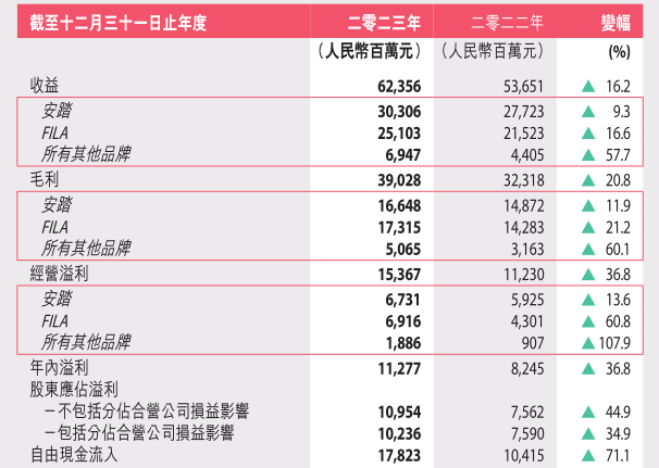 前不久,安踏体育发布了2023年的业绩报告。数据显示,2023年全年,安踏集团实现营业收入623.56亿元,同比增长16.2%,这也是安踏营收规模首次突破600亿元大关;实现净利润为109.45亿元,同比增长44.9%;若计入联营公司亚玛芬(Amer Sports)的收益,安踏归母净利润为102.36亿元,同比增长34.9%。