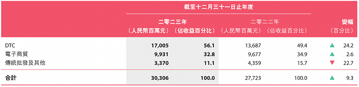 2023年全年,安踏主品牌实现报表收入303亿元,收入占比为48.6%。分渠道来看,安踏分部DTC、电子商务、批发收入同比增速分别为24.2%、2.6%、-22.7%。其中,DTC模式收入占比已经达到56.1%,较去年同期提升了6.7个百分点。