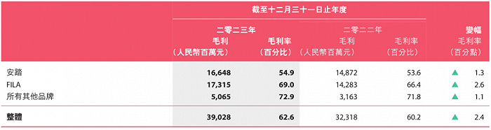 具体来看,安踏分部毛利率54.9%,同比上升1.3个百分点,主要受到持续的DTC模式转型所推动;FILA分部的毛利率同比上升2.6个百分点至69.0%,主要归因于本财政年度零售折扣情况有所改善;所有其他品牌毛利率为72.9%,同比提升1.1个百分点,创出历史新高。
