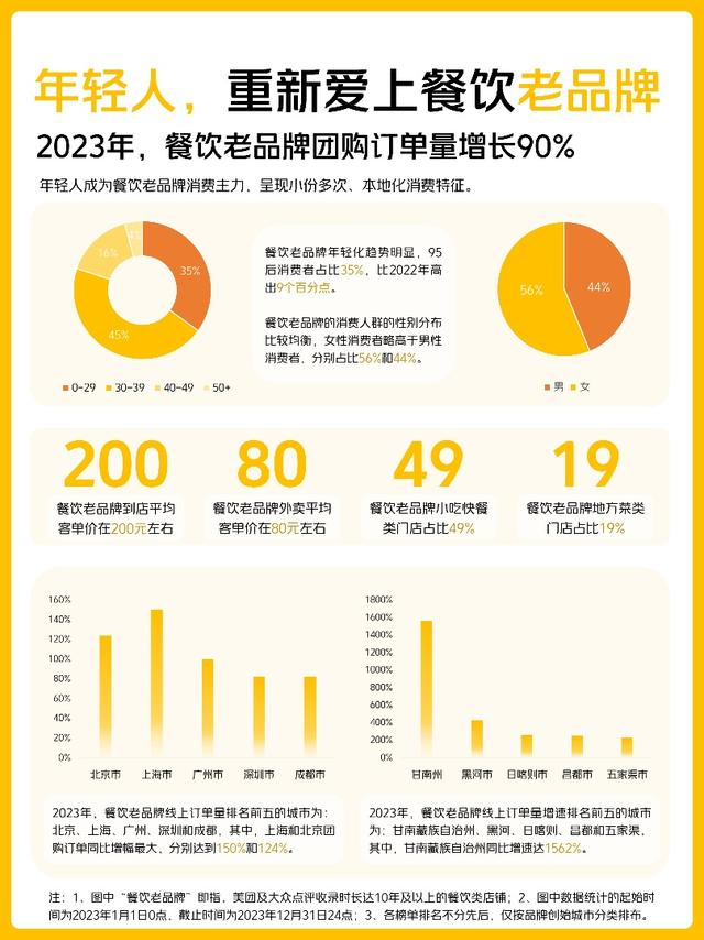 日前,美团发布《2023餐饮老品牌消费报告》。数据显示,2023年,美团、大众点评收录十年及以上餐饮老品牌到店团购订单同比增长90%,餐饮老品牌消费年轻化趋势明显,30岁以下消费者占比35%,较2022年高出9个百分点。