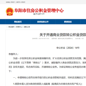 中国质量新闻网讯(李静) 4月8日,阜阳市住房公积金管理中心发布《关于开通商业贷款转公积金贷款的通知》(以下简称为“通知”)。