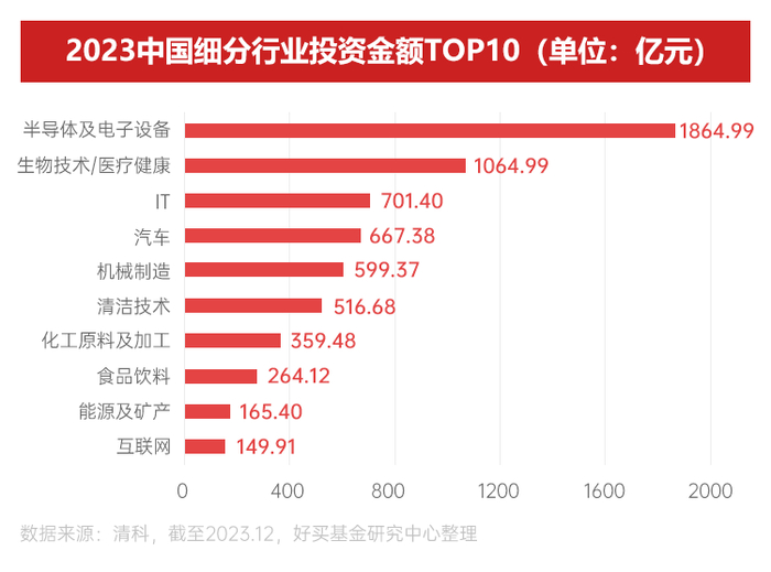 2023年,投资率例数、投资金额连续两年下滑,但降幅较2022年收窄,国有背景投资机构保持较高活跃度。结构上,半导体及电子设备、IT、生物技术/医疗健康三个行业是2023年最火热的领域。