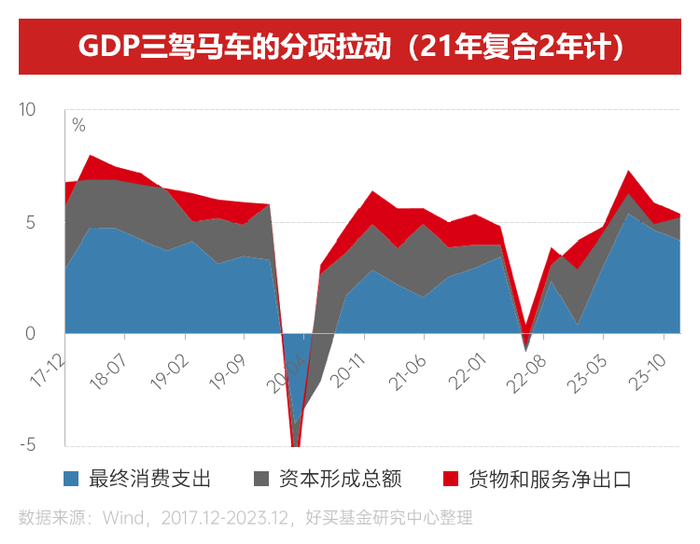 2023年全年看,国内名义GDP的增速为5.2%,但实际的GDP增速为4.2%。从平减指数来看,四季度的平减指初值为-1.43%,较三季度更低。另外从分项看,23年四季度消费贡献4.16%为最大分项,投资贡献1.2%,净出口贡献-0.16%。