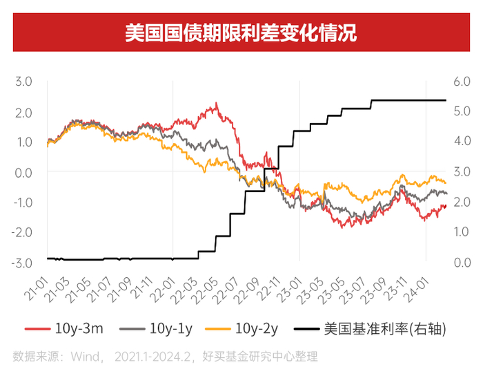 2月以来,美联储再度释放鹰派信号打压过度乐观的降息预期,加之通胀数据以及非农数据均有所超预期,美债收益率震荡上行突破4.3%。截至2月29日,10年期美债收益率约4.25%,2年期约4.64%,10年-2年美债收益率倒挂利差走阔至39bps左右。