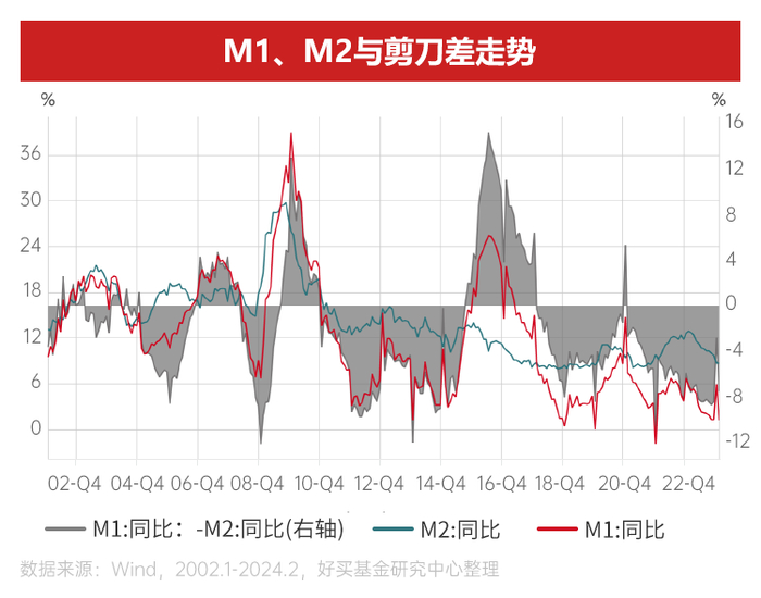 流动性方面,一季度央行宣布降准0.5%,向市场提供长期流动性约1万亿元,并于2月20日下调5年期LPR报价25bp至3.95%。同时,24年2月M1 由于春节错位效应较1月份下降明显,M1-M2剪刀差较上月也明显扩大,货币活化程度变弱。综合来看,货币政策的宽松信号明确,流动性整体充裕,但社融结构一般,广义流动性有待改善。