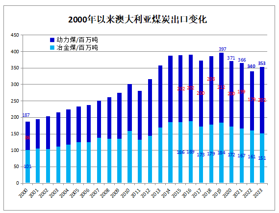 2023年,澳大利亚煤炭出口量预计为3.53亿吨,比上年增加1429万吨,同比增长4.2%。其中,动力煤出口量为2.02亿吨,同比增加2369万吨、增长13.3%;冶金煤出口量为1.51亿吨,同比减少940万吨、下降5.9%。