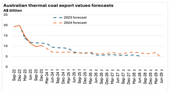 DISER 预计,随着煤炭价格持续下跌,澳大利亚动力煤出口收入将从 2023-24 财年的 360 亿澳元下降至 2028-29 财年的约 210 亿澳元(按实际价值计算)。展望期内,澳大利亚动力煤出口预计每年下降 2.6%。