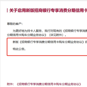 4月8日,招商银行信用卡中心发布了《关于启用新版招商银行专享消费分期信用卡购车分期业务协议的公告》(以下简称“新版协议”)。新版协议涉及购车分期业务的首付比例、分期额度、还款模式等方面,并将于自5月23日起生效。