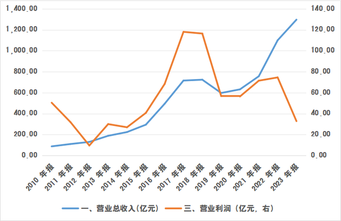 2023年,广汽集团的营业收入为1,297.06亿元,营业利润仅为32.83亿元;而在2015年,广汽集团营业收入为294.18亿元,而营业利润为40.65亿元。可以看出,在2023年营业收入增长近4倍情况下,广汽集团的营业利润竟出不如2015年。