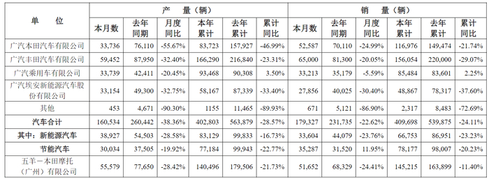 根据2024年3月的产销快报显示,2024年一季度广汽集团的汽车累计产量为40.28万辆,同比下降28.57%%;累计销量为40.97万辆,同比下降24.11%。这其中,做为转型方向的新能源汽车也出现大幅下降。广汽新能源汽车一季度销量为6.68万辆,同比下降23.23%;广汽埃安的销量仅为4.89万辆,同比下降了37.60%。