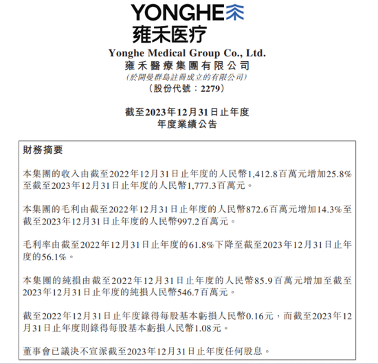 仅销售和营销费用一项,雍禾医疗在2023年就达到了10.44亿元,较上年同期增加了约2.78亿元,增幅36.2%;一般及行政开支则增加了1.17亿元,增幅45.5%;通俗来说去年雍禾医疗花在销售、广告营销以及人力、管理方面的成本较上年度增加了不少,所以导致全年度亏损加剧。