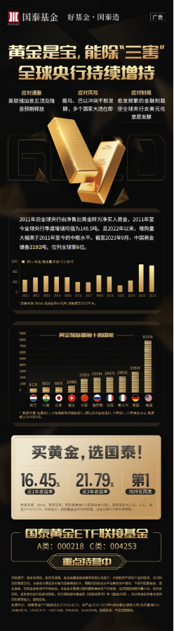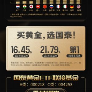 注:黄金基金ETF主要投资对象为黄金现货合约,预期风险收益水平与黄金资产相似,不同于股票基金、混合基金、债券基金和货币市场基金。在投资本基金前,投资人应全面了解本基金的产品特性,充分考虑自身的风险承受能力,理性判断市场,对认购、申购或二级市场买入基金的意愿、时机、数量等投资行为作出独立决策,获得基金投资收益,亦承担基金投资中出现的各类风险,包括:因整体政治、经济、社会等环境因素对黄金价格产生影响而形成的系统性风险,流动性风险,基金管理人在基金管理实施过程中产生的基金管理风险,本基金的特定风险等等。黄金ETF联接主要投资对象为国泰黄金ETF,预期风险收益水平与黄金资产相似,不同于股票基金、混合基金、债券基金和货币市场基金。观点仅供参考,不构成投资建议或承诺。市场有风险,投资需谨慎。