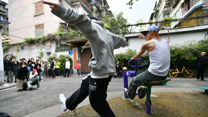 就是这么简单的理由,简单的场景和简单的rap,却在清明节期间形成了如“迪士尼”一般的流量。在各大网友晒出的视频中,年轻人成群结队来到诺米拍摄MV的地方,坐在跷跷板上模仿他的“艺术行为”,甚至也有大爷大妈加入其中,和年轻人一起真实而具体地感受一场“人造狂欢”。