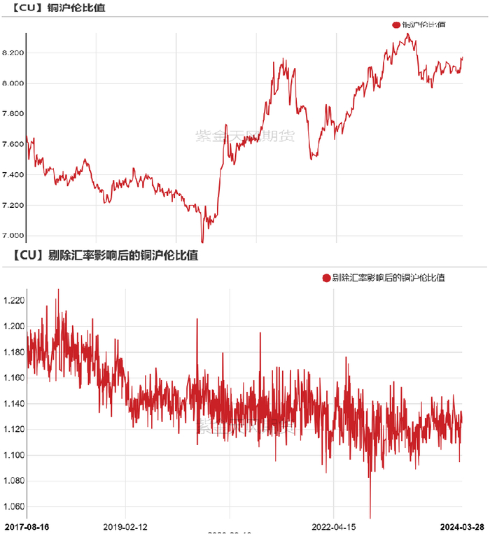 上周铜价延续涨势,随着内外盘大幅上涨,沪伦比值大幅增至8.17左右,但周初国内节假日跟涨乏力,沪伦比值迅速回落至8.04附近,铜进口亏损状态持续,亏损水平依然在700元/吨左右,远月亏损水平已有利于出口盈利。短期关注国内跟涨情绪及汇率波动对比值行程的影响,高位可适当反套。