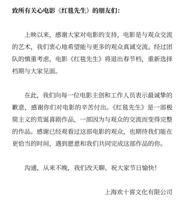 春节档电影《红毯先生》撤档声明。