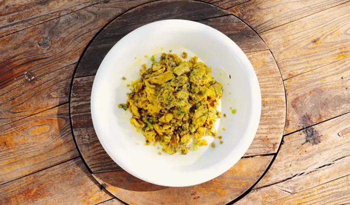 谷雨前香椿头,新鲜农家草鸡蛋,野生小葱,碰撞出香气四溢的经典春菜:香椿炒蛋。香椿洗净切末,备葱花,打入鸡蛋,香椿末撒入鸡蛋,打散打匀,葱花增香。热锅热油,倒入蛋液煎至定型,翻面续煎,两面金黄后炒碎出锅。